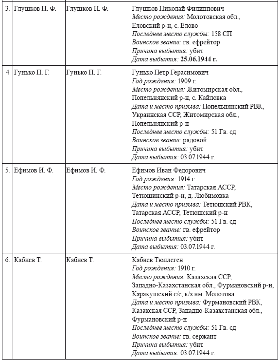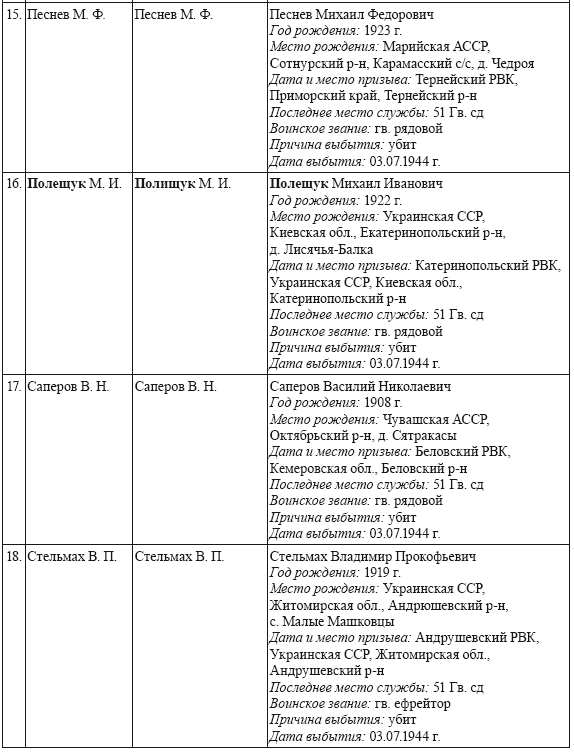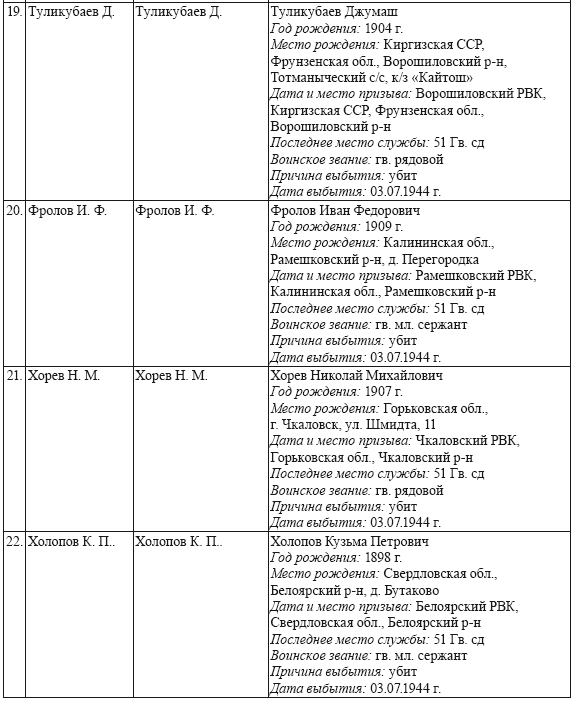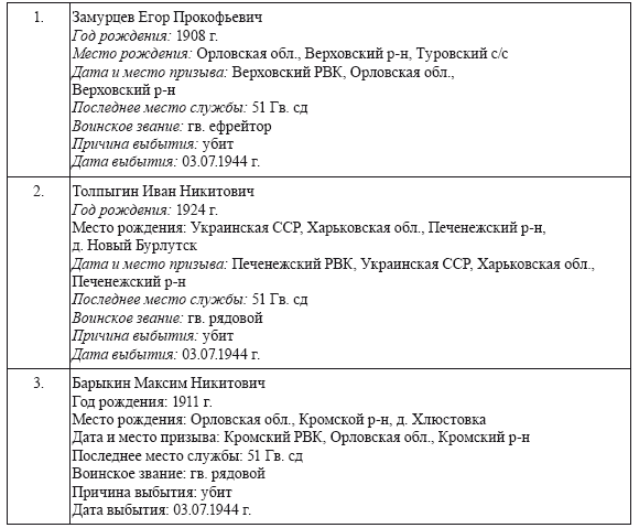 Среди воинов 158-го гвардейского Краснознаменного стрелкового полка 51-й гвардейской стрелковой дивизии, погибших 3 июля 1944 г. в г. Полоцке и захороненных в могиле № 185 наряду с другими гвардейцами, в архивных документах значатся также следующие (см. табл. 2).