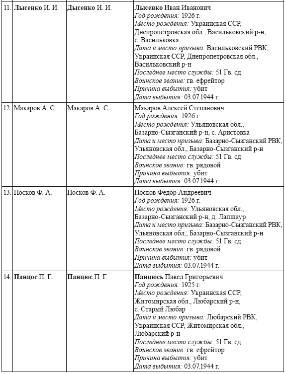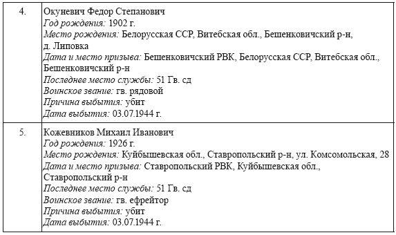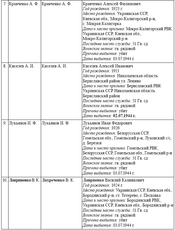 Сведения о гвардейцах 51 Гв. сд., погибших при освобождении г. Полоцка 3 июля 1944 г. и захороненных в могиле № 185 [1; 7; 12; 18; 25]
