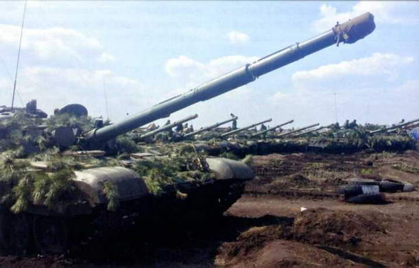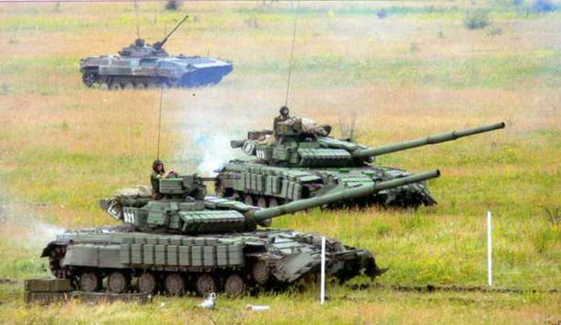 Вверху: танки одной из бригад ополчения на учениях. На фото представлена, по-видимому, вся матчасть танкового батальона (слева-направо): Т-64БМ, три Т-72Б и пять Т-64БВ, т.е. фактически это рота, а не батальон. Лето 2015 г.