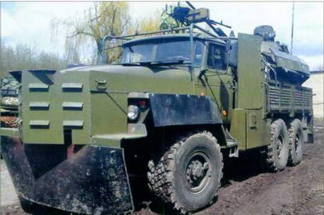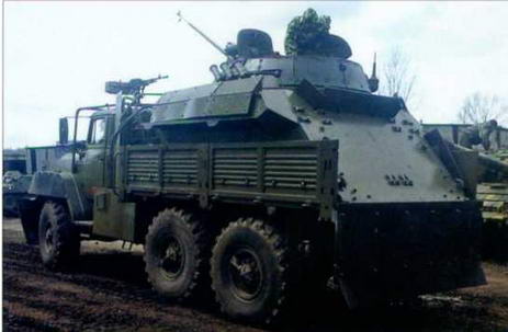 Один их импровизированных бронеавтомобилей ополченцев, выполненный на основе бортового «Урала». Капот автомобиля получил дополнительную кустарную броневую защиту, а в кузове каким-то образом установлено боевое отделение с башней БМП-2.