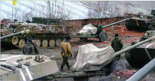 Не лишним будет напомнить, что в 2013 г. в Артемовске (Донецкая область) на 1282-й базе хранения, известной также как в/ч А-2730, имелось более 100 единиц БТТ, в числе которых были Т-72АВ, Т-72Б, Т-80БВ, Т-62, Т-64БВ, ПТ-76Б, БТР-70/80, БМП-1/2, БРЭМ-2, БТС-4А, 2С1 «Гвоздика», 2СЗ «Акация», 2С9"Нона" и БМ-21 во вполне пригодном для ремонта состоянии. Эта техника могла целиком закрыть первоначальные потребности ополченцев, тем более что после известных событий все имущество базы перешло в их руки. Как и во многих других подобных случаях, техника числится как "захваченная сепаратистами", но по некоторым данным, здесь имела место бескровная передача БТТ за некоторое вознаграждение в твердой валюте. Известно, что минимум один отремонтированный и модернизированный на КБЗТ танк Т-72Б уже летом 2014 г. (т.е. после начала АТО!) был продан "сепаратистам".